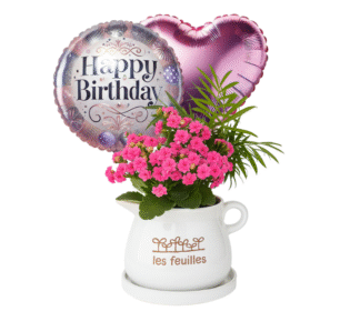 קוקטייל צמחים בקומקום אדום עם בלון לב ושוקולד