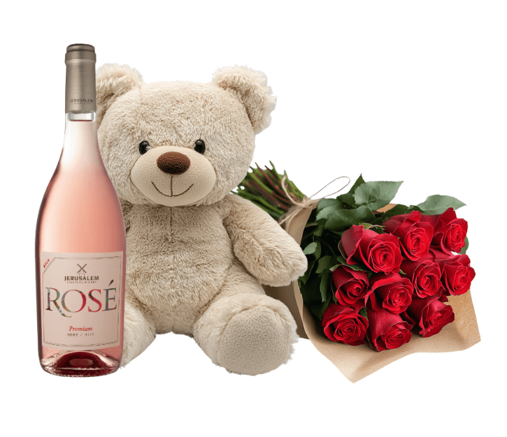 זר קלאסי של 11 ורדים אדומים נקיים וללא תוספות, סמל האהבה והיוקרה, יחד עם דובי בז' רך ומתוק שיחמם כל לב, ובקבוק יין רוזה פרימיום מבית יקב ירושלים – קליל, פירותי ומושלם לרגעים מיוחדים.