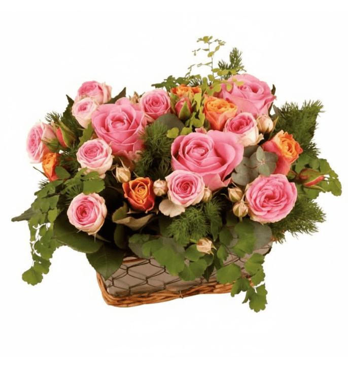סידור פרחים ורוד-כתום בסלסלת קש ללא ידית.