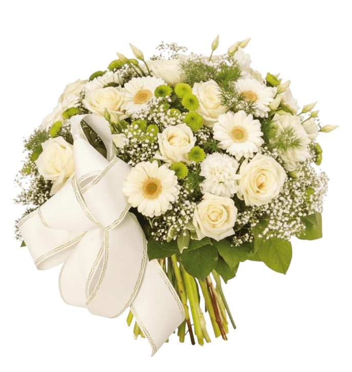 זר עגול בלבן וירוק עם ורדים וגרברות.