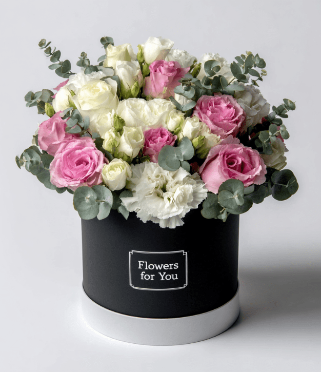 קופסת פרחים יוקרתית "לונדון" – שילוב מוקפד של פרחי ליזיאנטוס לבנים וורדים ורודים בהירים יחד עם עלי אקליפטוס רעננים, המסודרים בקופסה עגולה שחורה אלגנטית. עיצוב קלאסי ומלא סטייל שמעניק מראה רומנטי ומרשים, מתנה מושלמת לאהבה, ימי הולדת ואירועים מיוחדים.